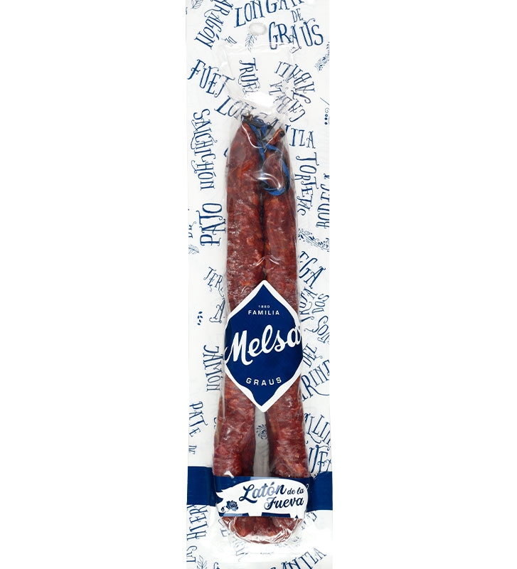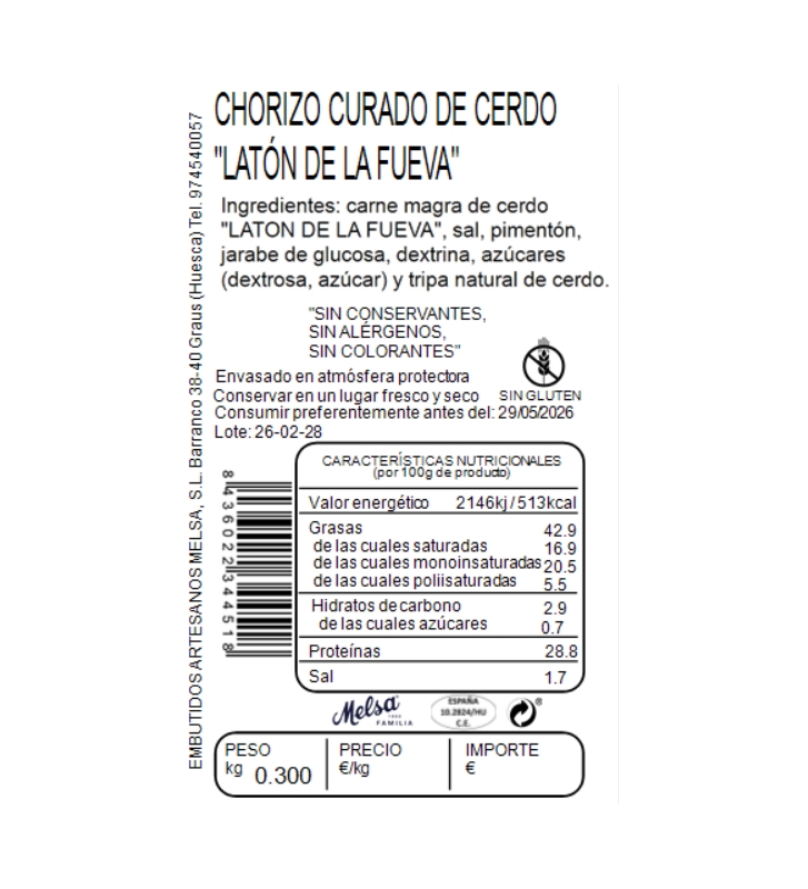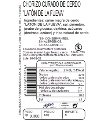 100% LATON DE LA FUEVA. Elaboración tradicional en tripa natural de cerdo, hecho con carne de Latón 100% y condimentado con una equilibrada mezcla de pimentones de la Vera. Excelente perfil lipídico.