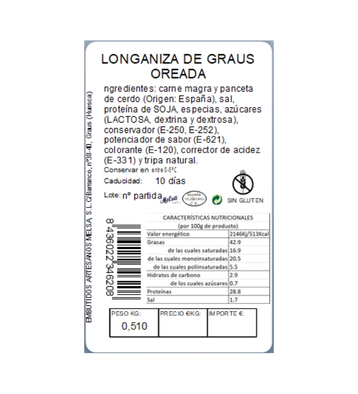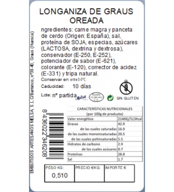 LONGANIZA DE ARAGON EXTRA "C" CALIDAD Piezas de 300 g. Envasada en atmósfera controlada y con caja.